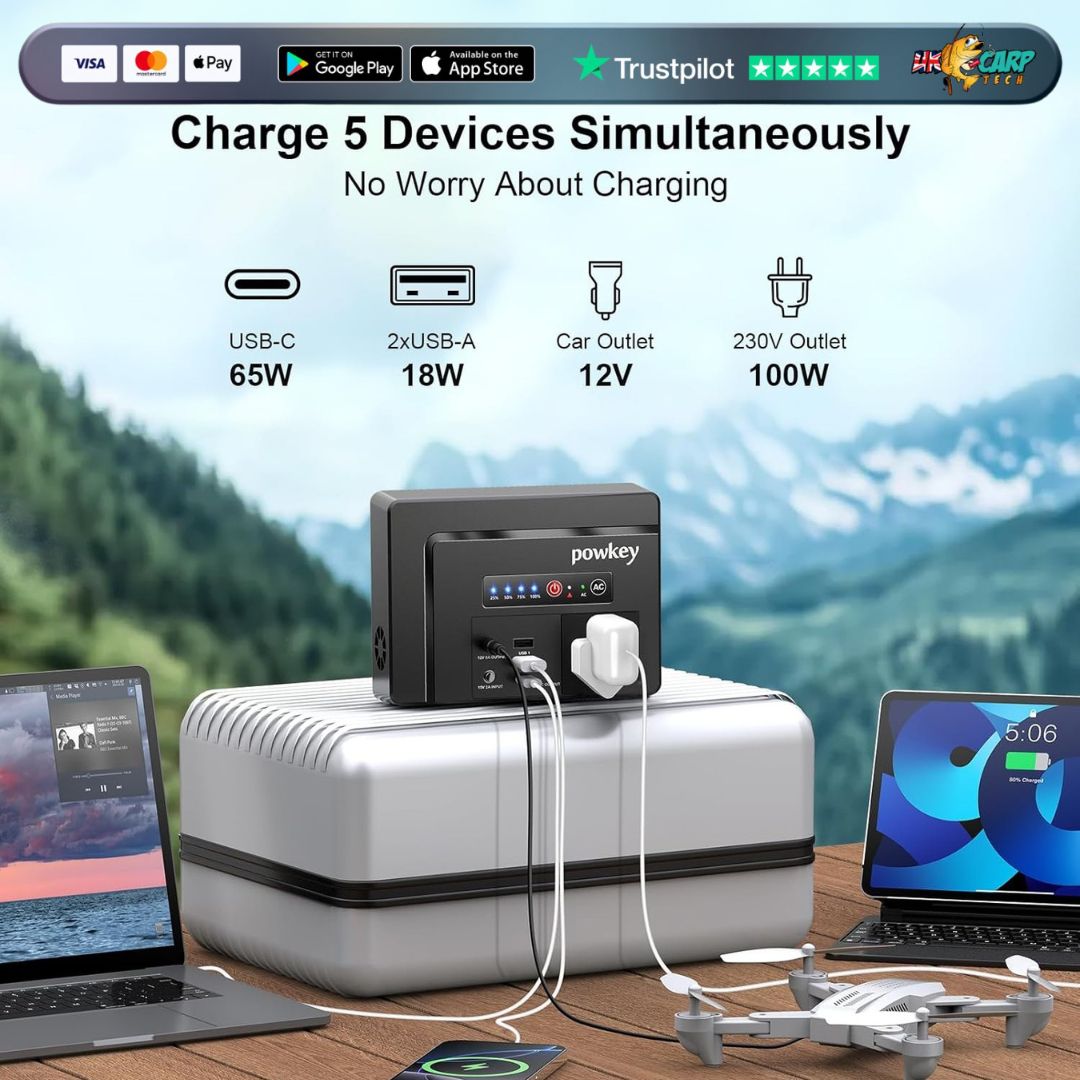 • 5 Multiple Outputs Battery Pack. Equipped with 5 Outputs, 1 x AC socket (100W/230V), 1 x DC port(12V 8A), 2 x USB-A port and 1 x USB-C port, Powkey protable power station for camping can be compatible with most electronic devices on the market and support to charge 5 different electronic devices at the same time. Just take this portable power bank with socket on the go and you can charge most of your electronic devices in time. In addition, the DC input (15V 2A) can also be used with a solar panel (NOT Included) to recharge this small solar generator outdoor/camping.